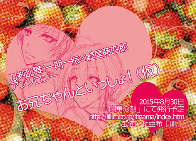 - FLYER ![]() ※イベントでの配布は終了しました。 ※現在フライヤー配布についての募集は行っておりません。 - SPECIAL THANKS *** 大陽出版株式会社さま *** とうらぶサーチさま *** とうらぶオフライン企画まとめさま *** ミントBlueさま/写真素材お借りしました *** sucrette*worksさま/表紙デザインをして頂きました - LINK ■一鯰アンソロ[いちごとアクアリウム] ■http://lill.moo.jp/itinama/ ■同人関連サイトさまのみリンクフリー ■リンクは必ずTOPページからお貼り下さい。他のページですと予告なく消える場合があります。 - CONTACT ■杜亜希 ■chieri_lp☆yahoo.co.jp ■http://lill.moo.jp ■Twitter:@onnotes / PixivID:13870952 |